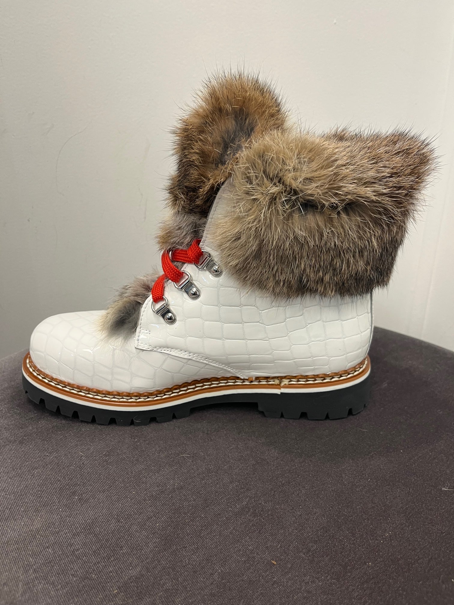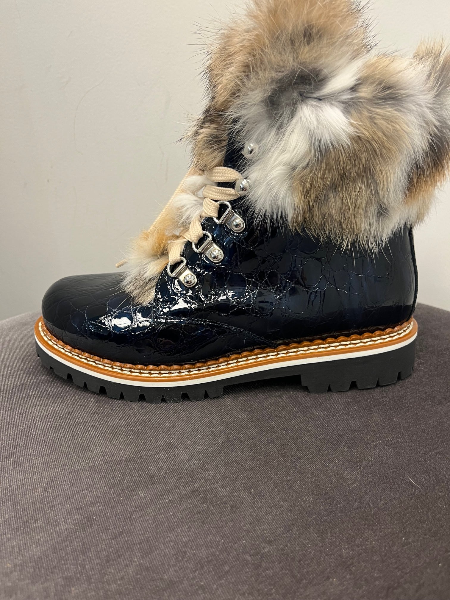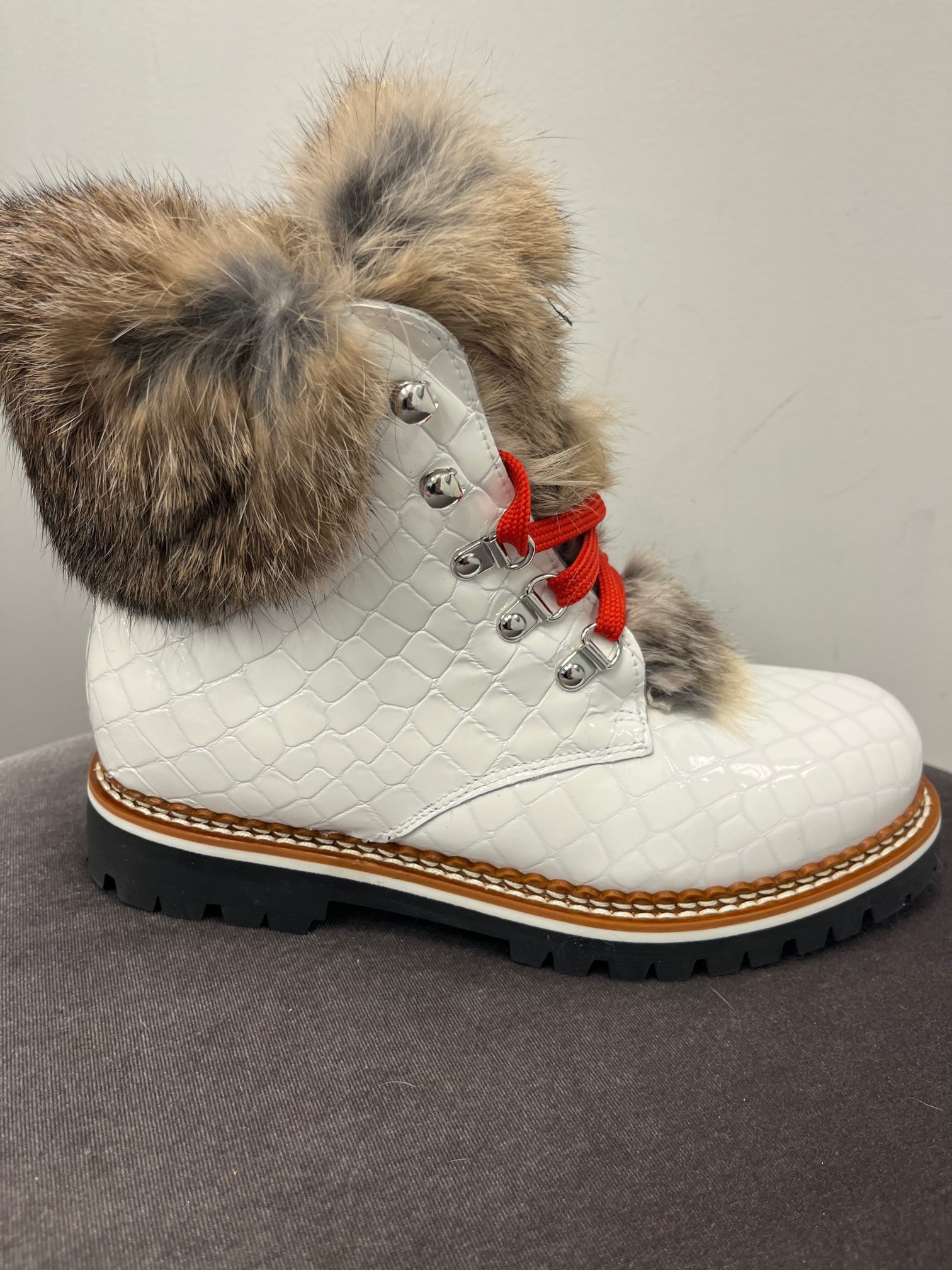 Beautiful embossed leather, fur trimmed, and lined winter boot. Every pair includes two sets of laces. These are show stoppers and a must have in your winter closet!