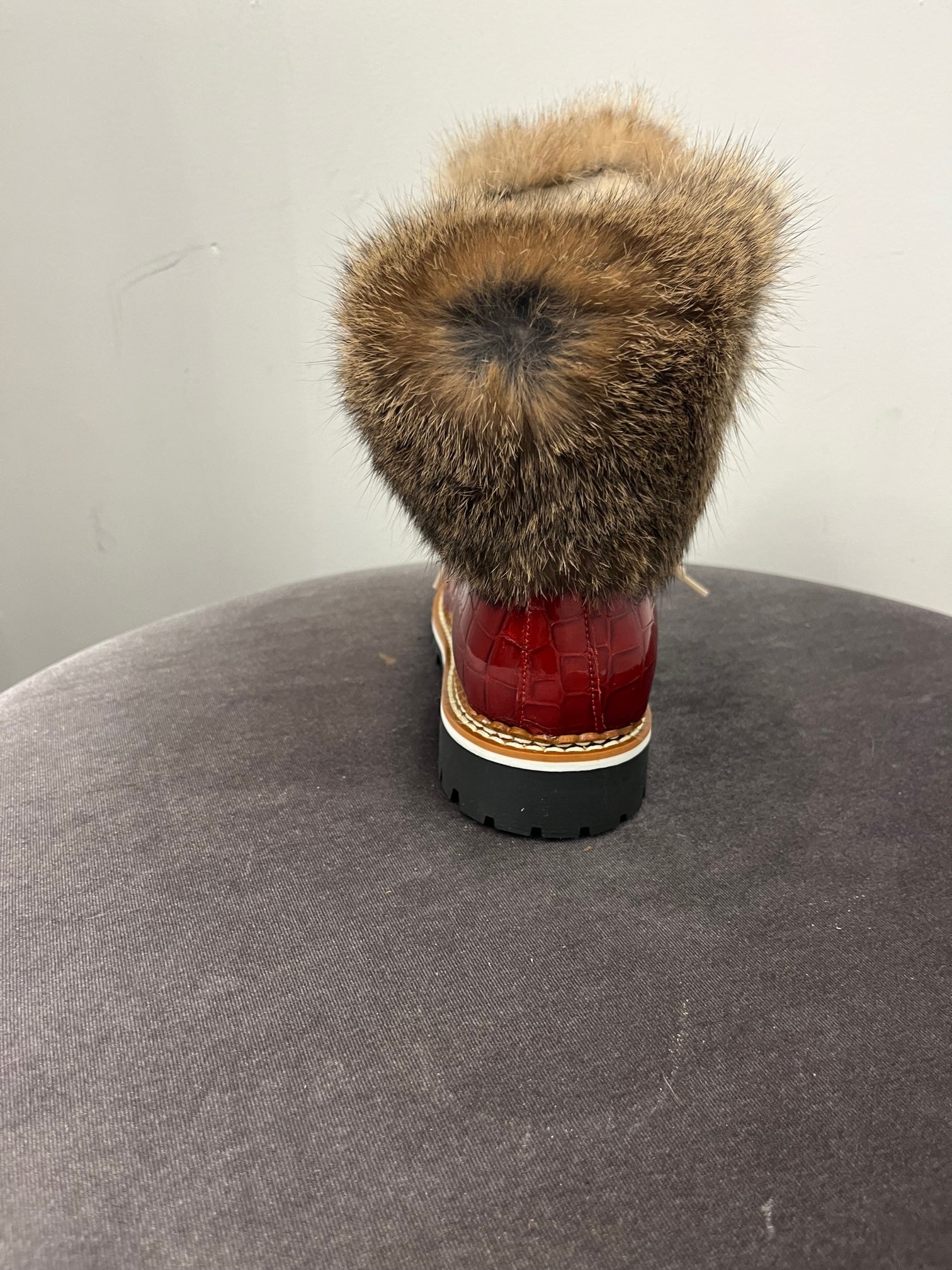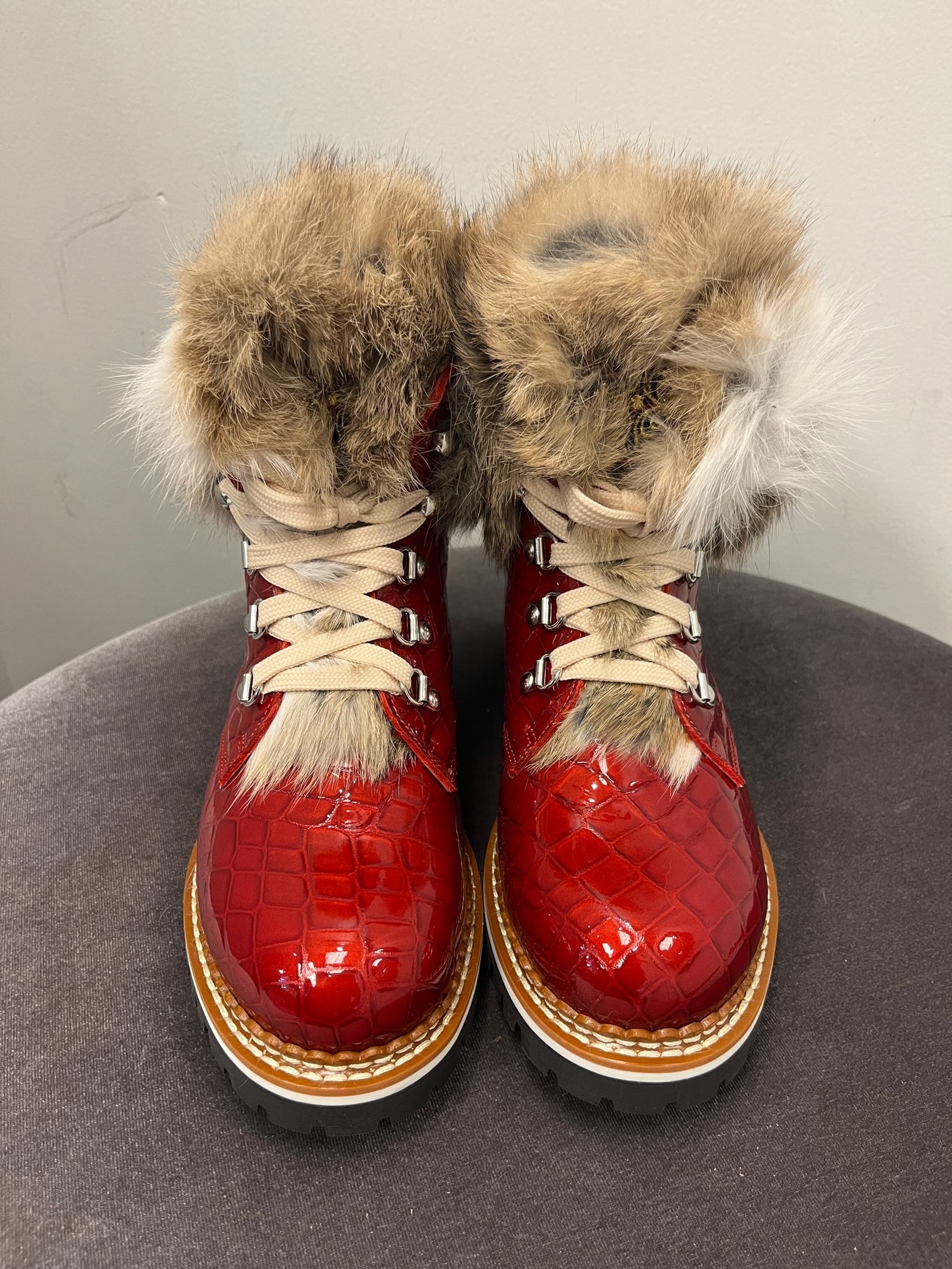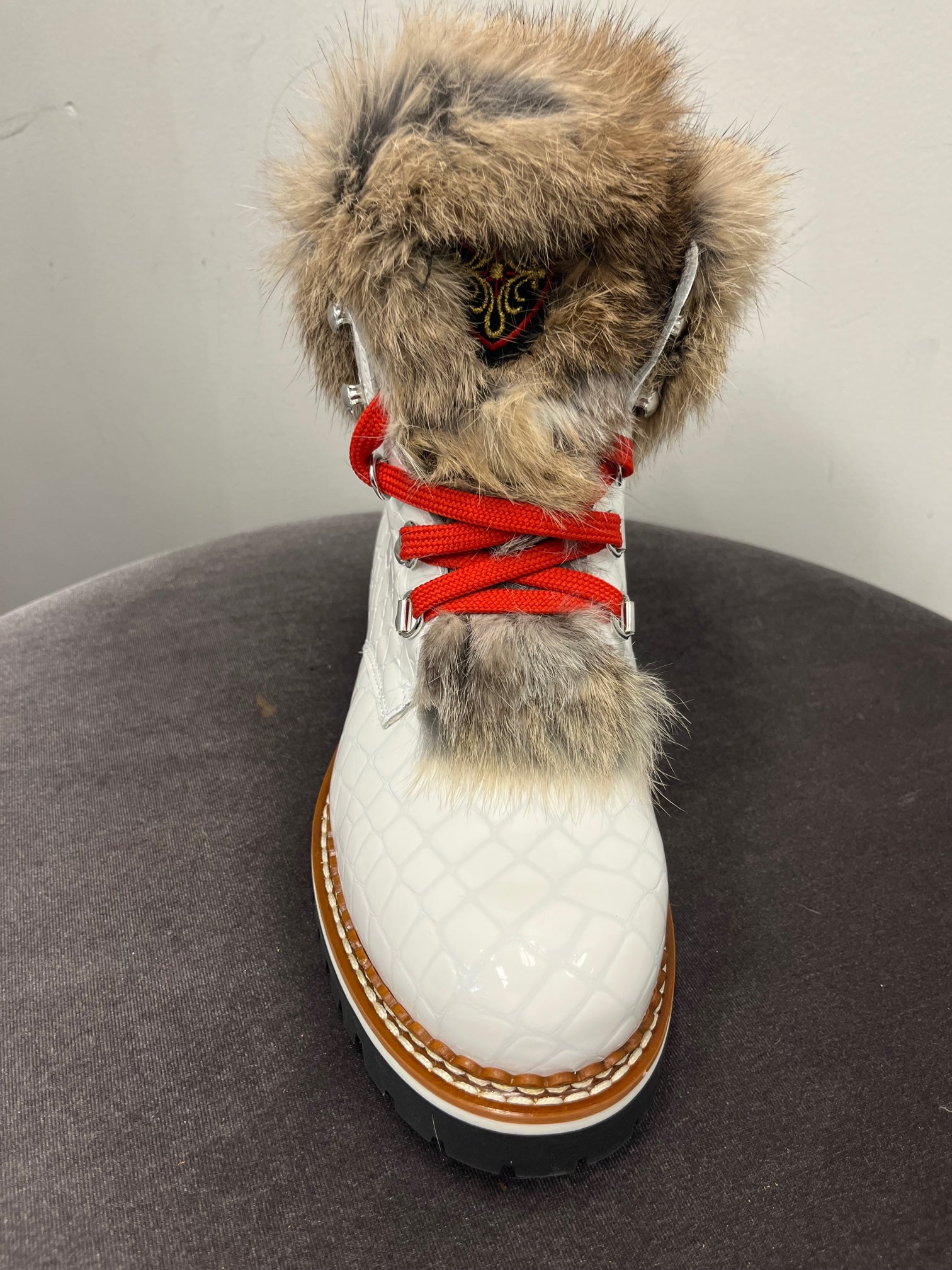 Beautiful embossed leather, fur trimmed, and lined winter boot. Every pair includes two sets of laces. These are show stoppers and a must have in your winter closet!