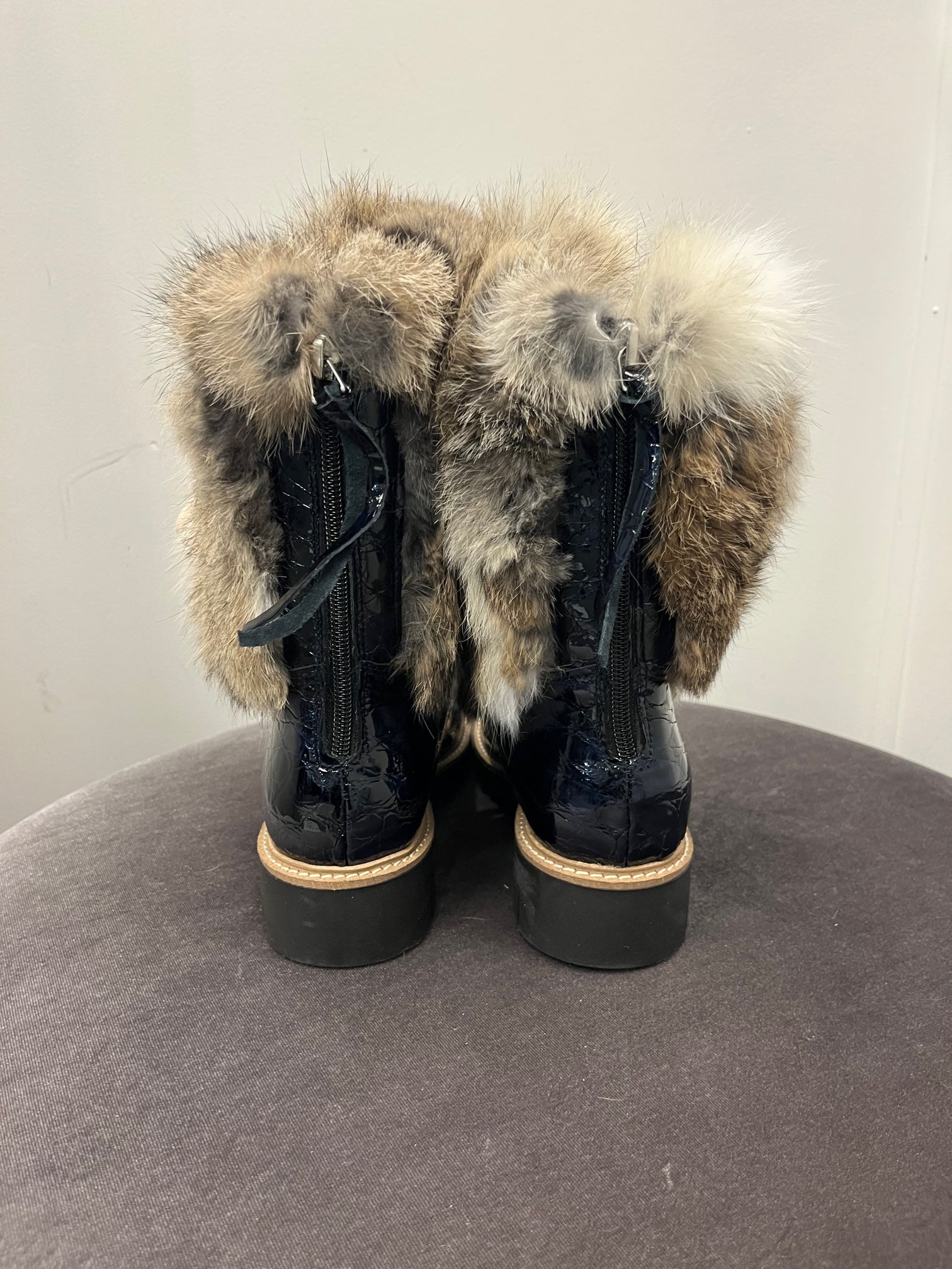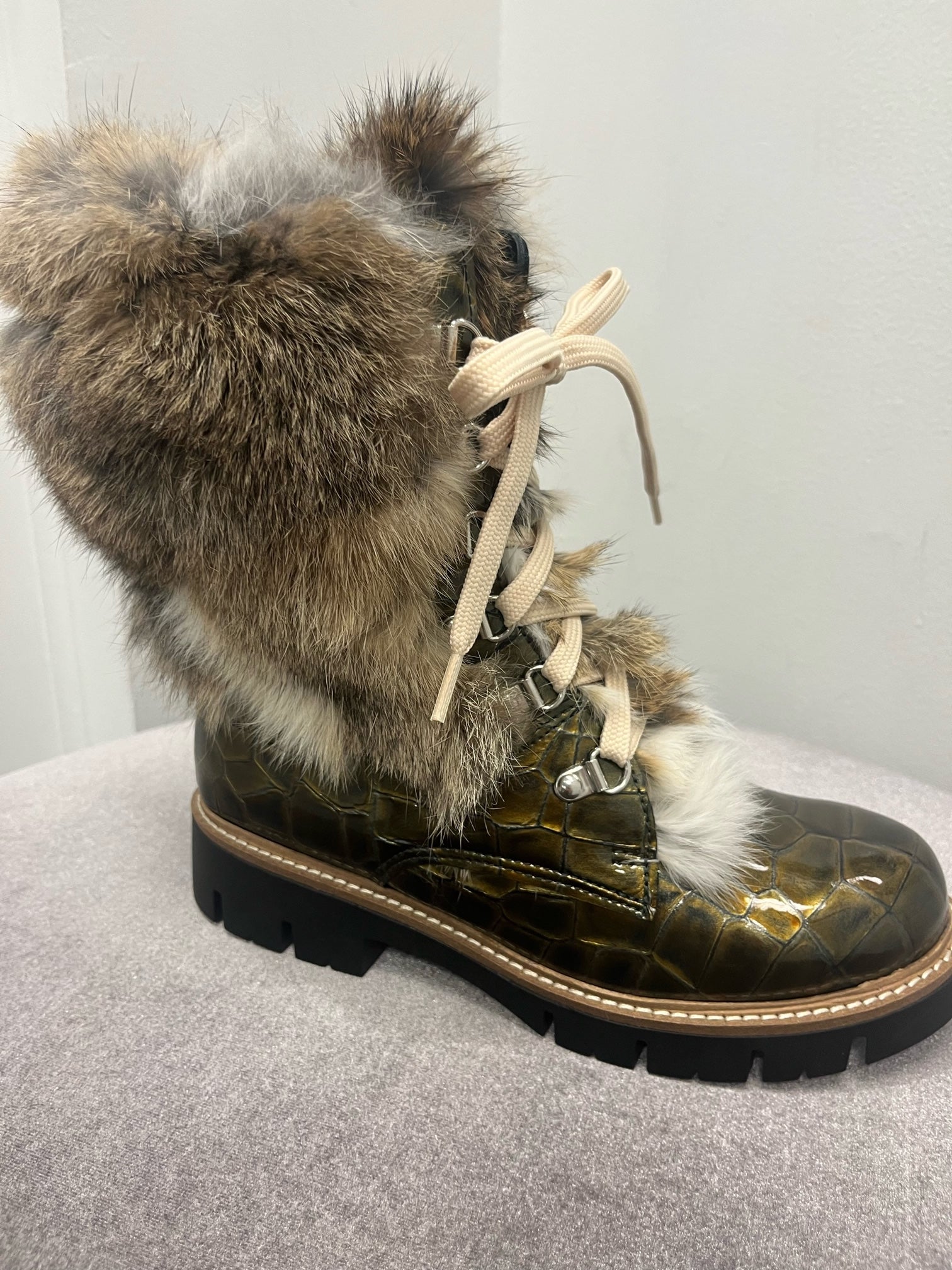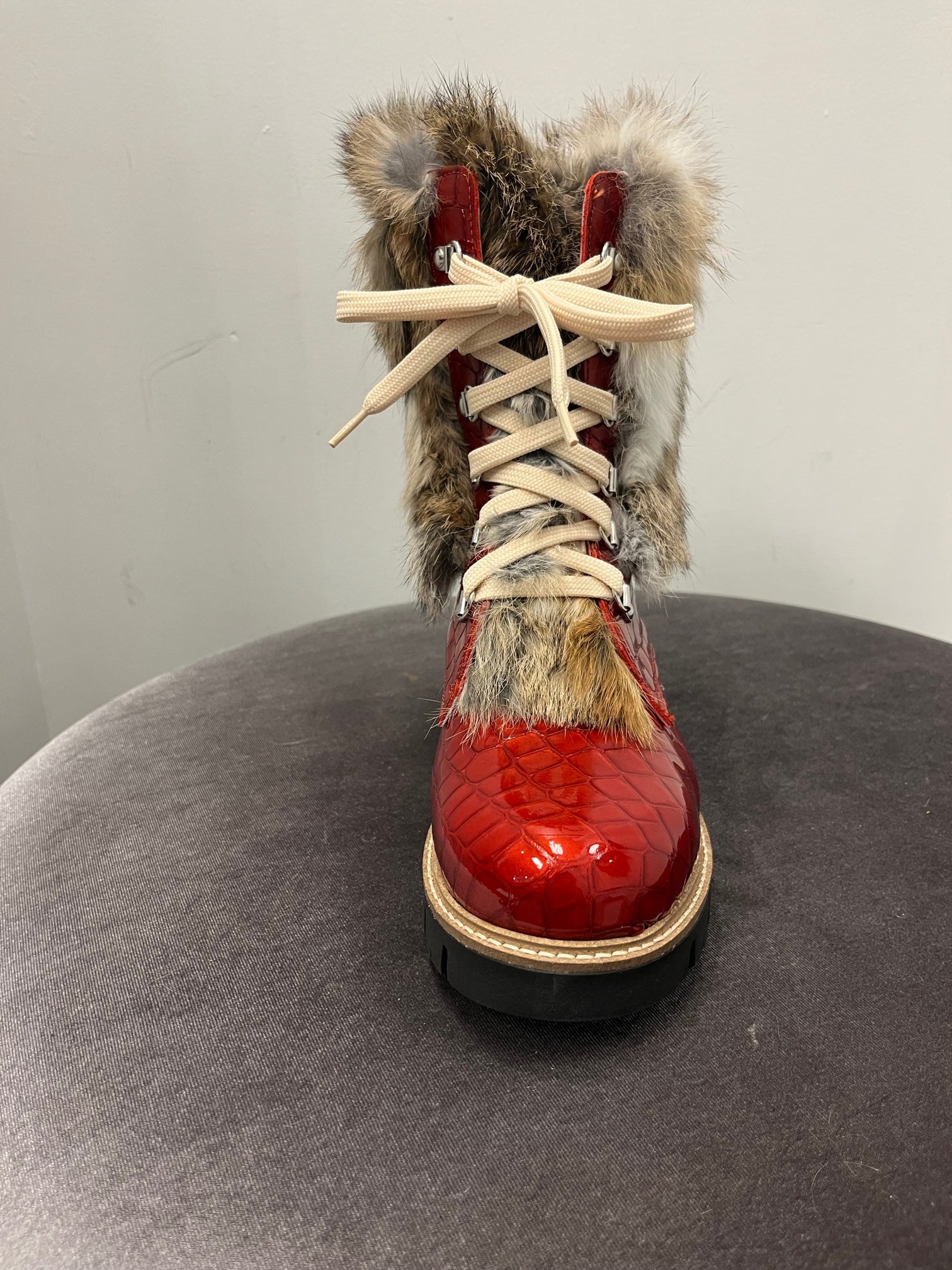 Beautiful embossed leather, fur trimmed, and lined winter boots with back zipper for easy slip on. Two sets of laces are included with every pair. These stylish winter boots are perfect for any ski trip or snow-filled getaway.