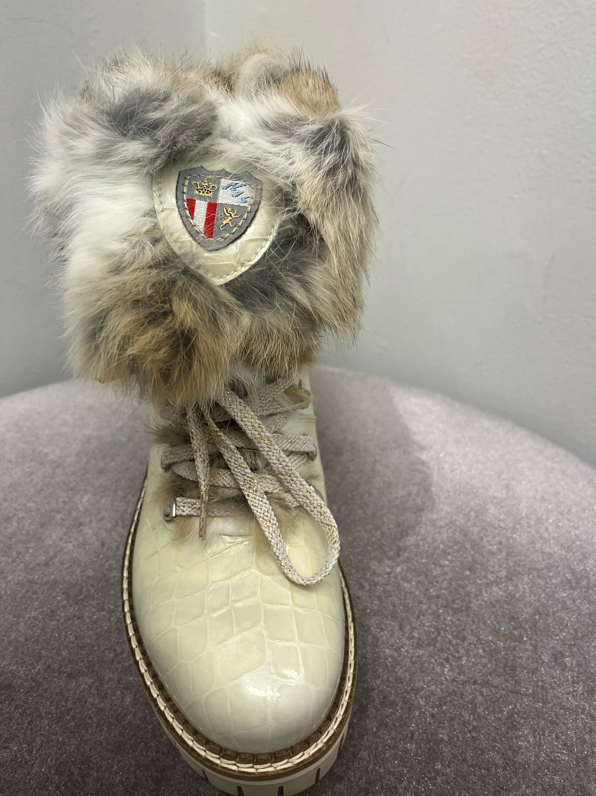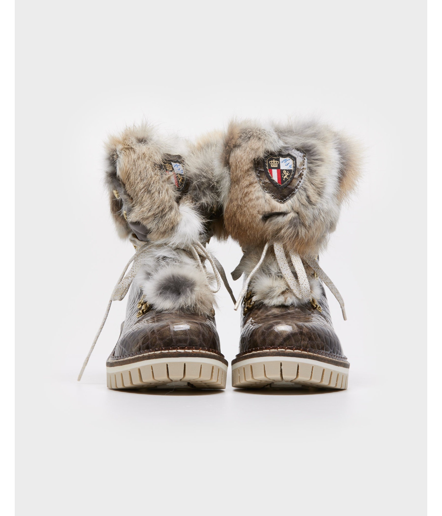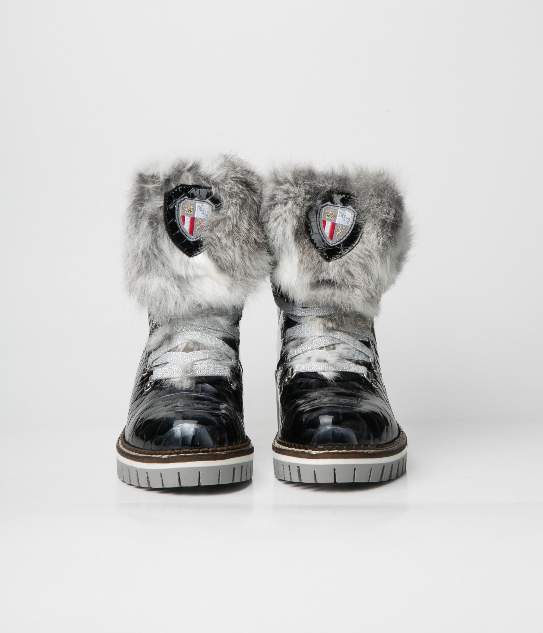 Lace-up ankle boot made of black patent calfskin leather and 'Croco' Effect with lapin fur collar. For the full comfort of your feet, the lining is made of warm fabric and the insole of pure wool.